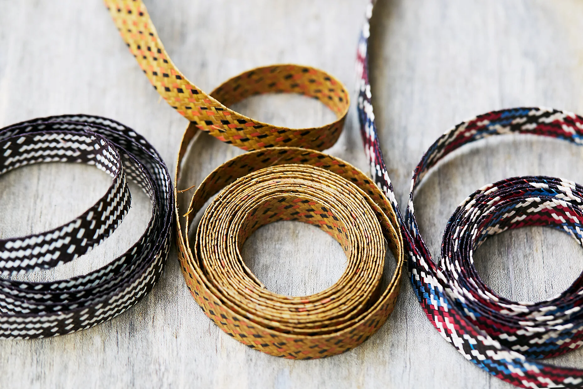 The black and white sombreros are made from a cane called caña flecha. The caña flecha is dried after the veins have been stripped out. Then the cane strips turn from green to a beige or whitish color as they dry. Darker strips are dyed with a black mud and then the caña flecha is woven into braids that will form the hat. When all the braids, olma and wings are completed, the hat is sewn together with a peddle sewing machine.