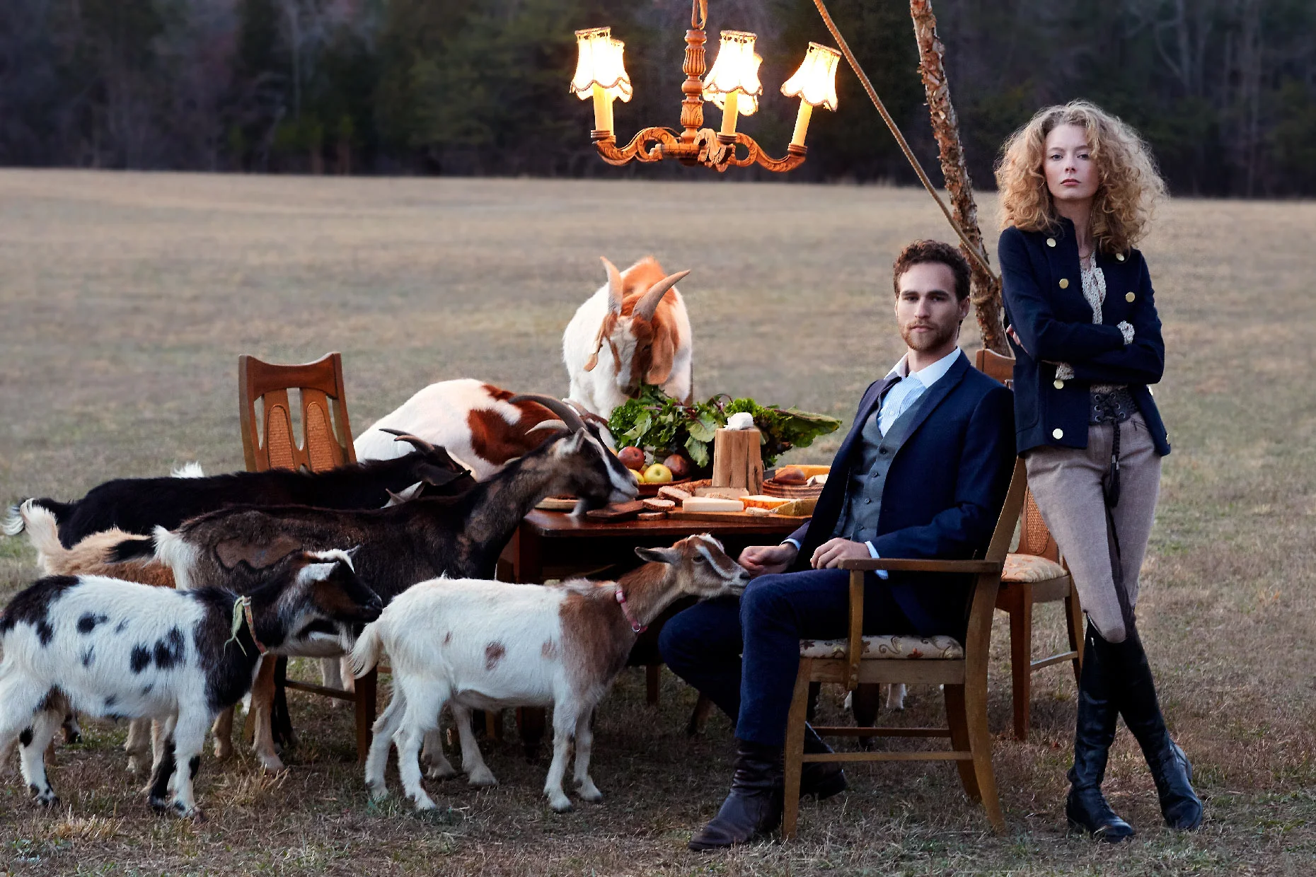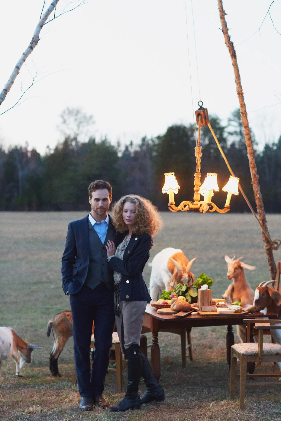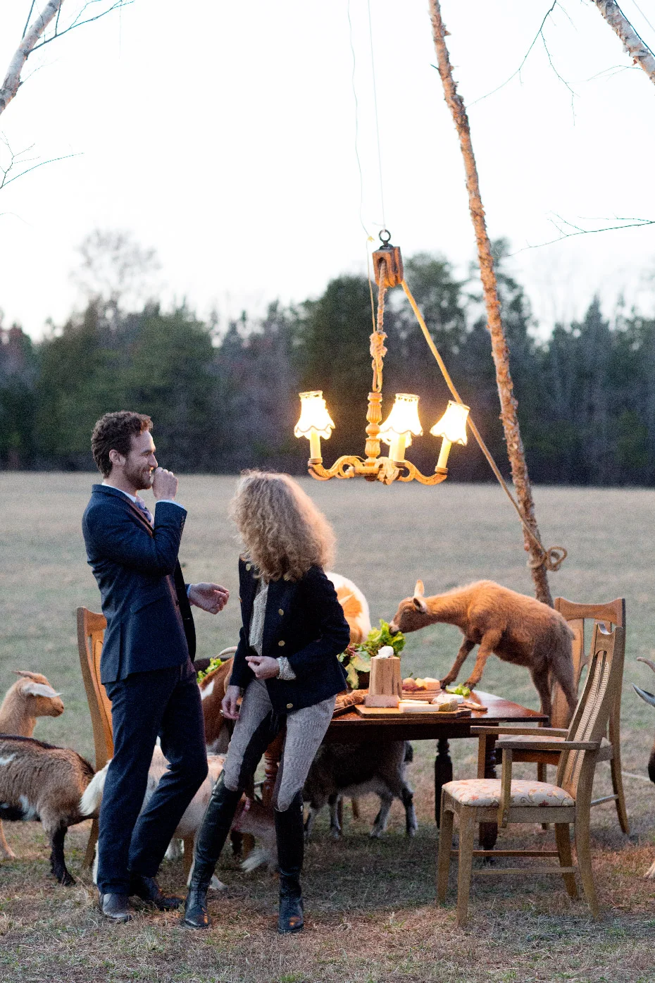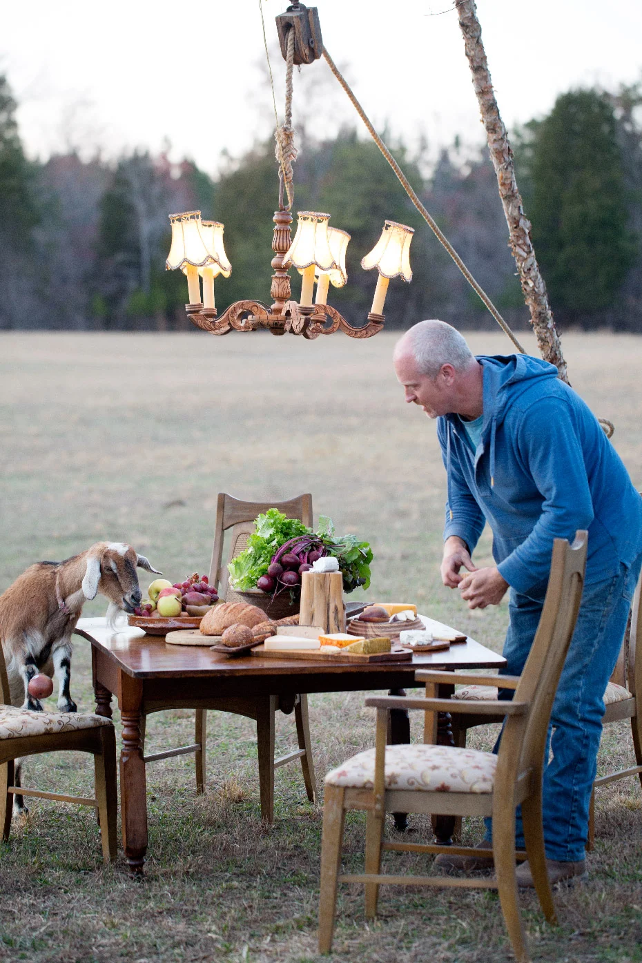 We had such a fun time shooting Part III of Fashionable Farmers. It was the last shot for the day and it was worth the wait for sure. Matt, our stylist put up a tripod to hang a chandelier and laid out a delicious spread on the table and then it was go time. It was pretty funny to try to ignore the goats jumping up on the table and basically devouring the food,.