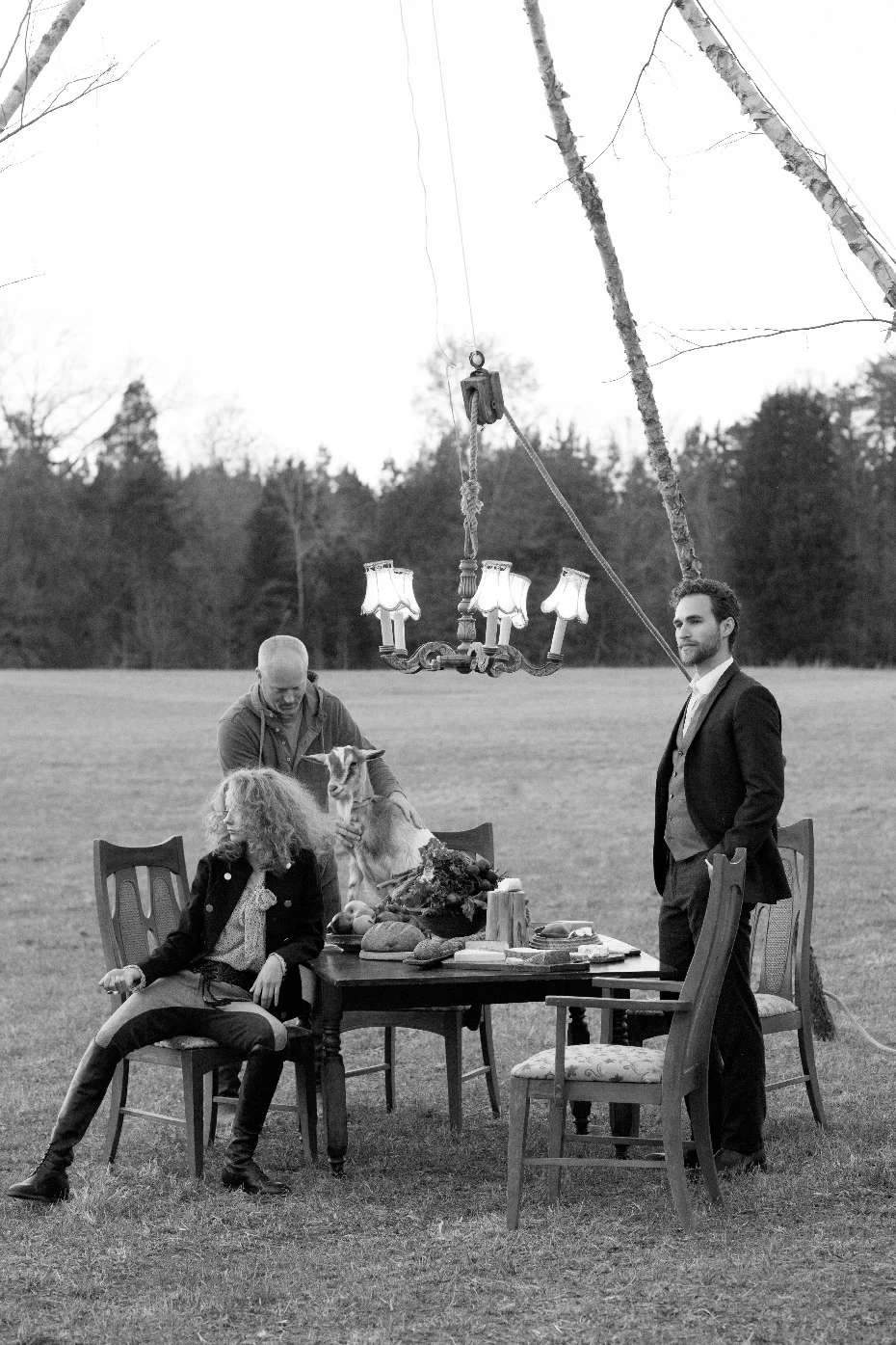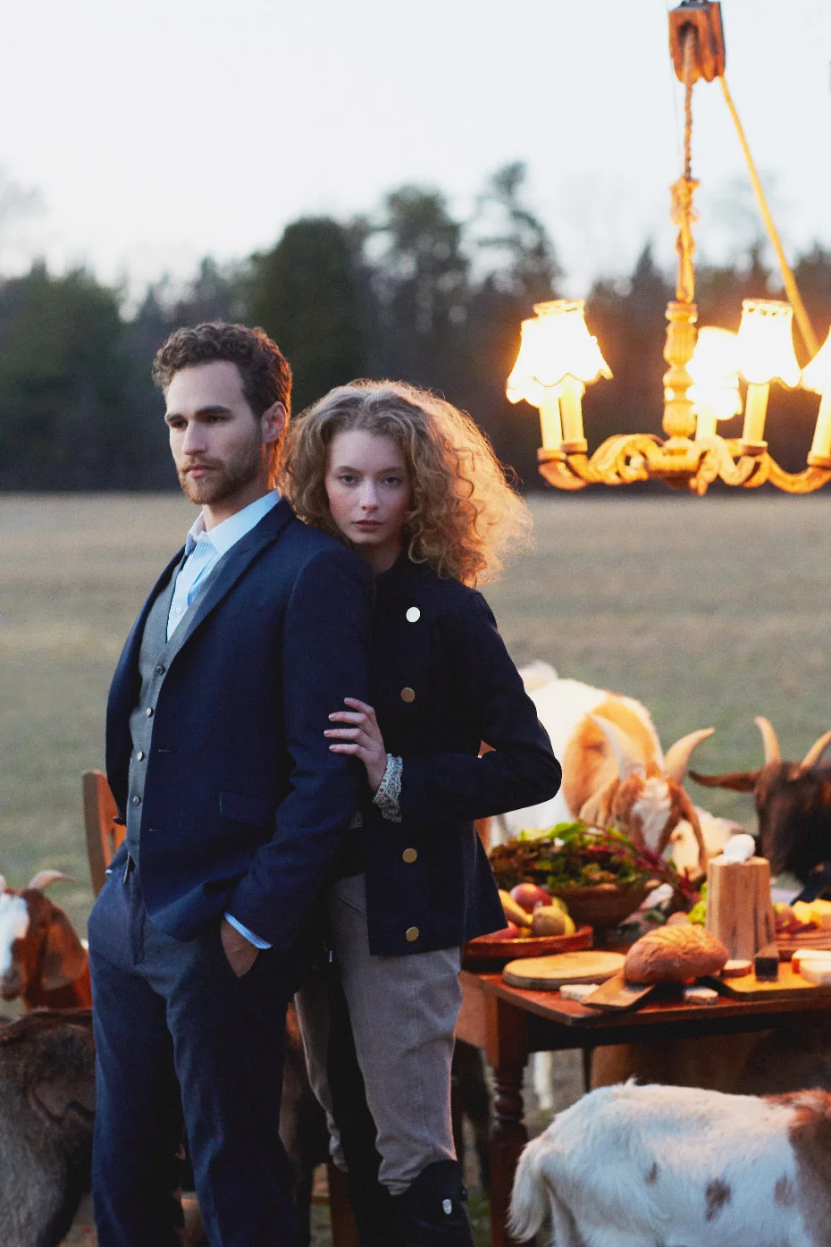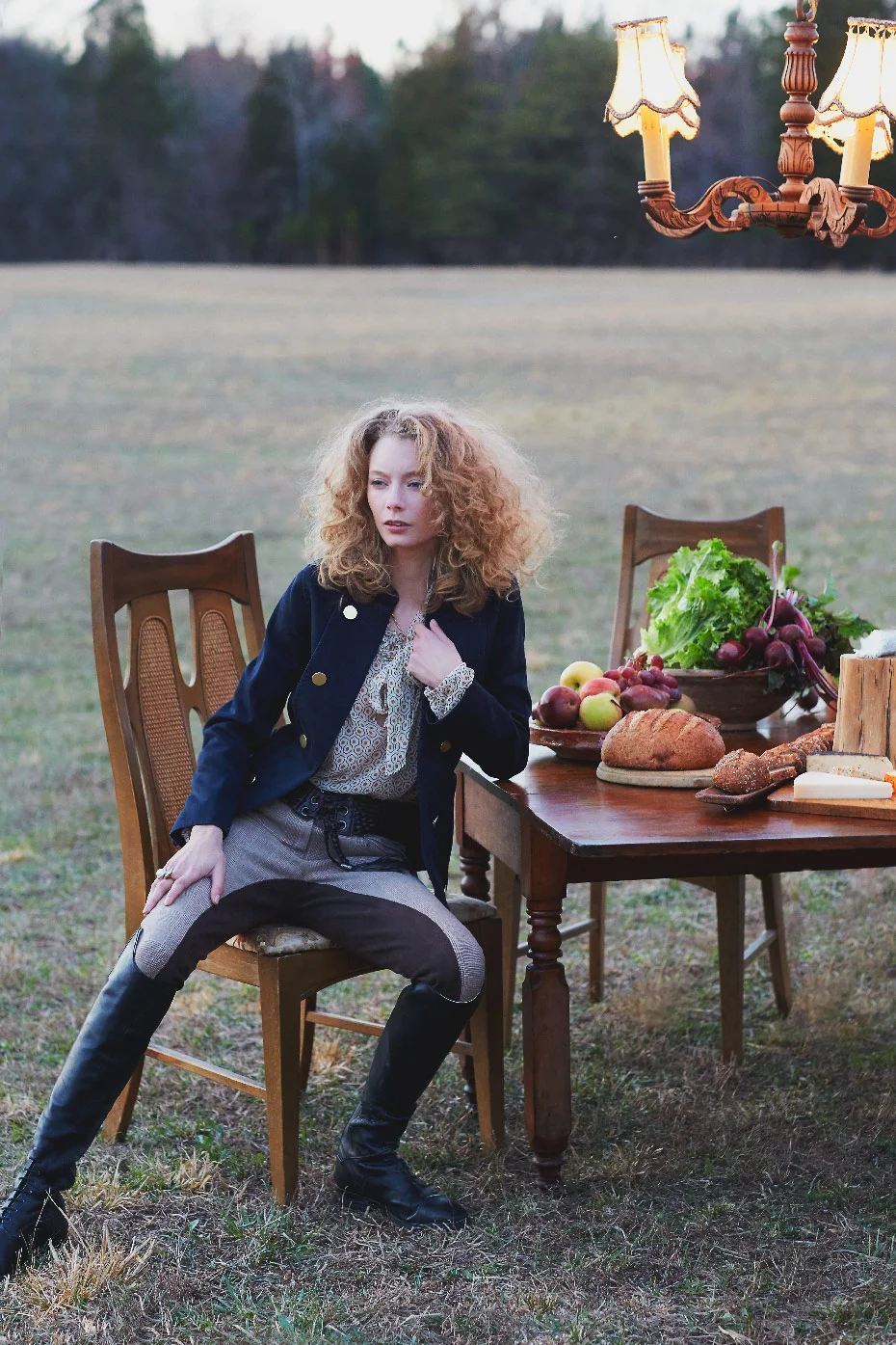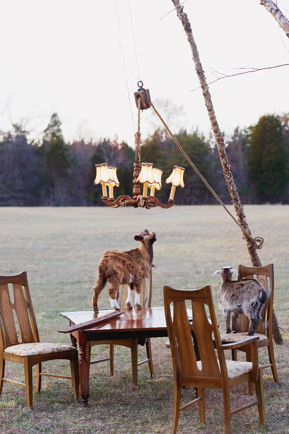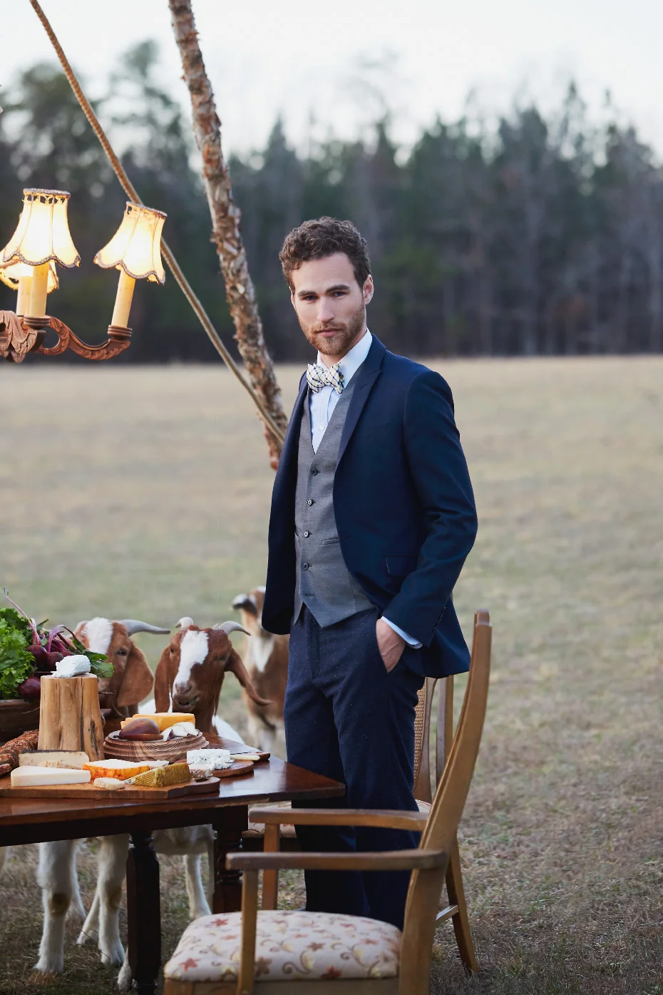 We had such a fun time shooting Part III of Fashionable Farmers. It was the last shot for the day and it was worth the wait for sure. Matt, our stylist put up a tripod to hang a chandelier and laid out a delicious spread on the table and then it was go time. It was pretty funny to try to ignore the goats jumping up on the table and basically devouring the food,.
