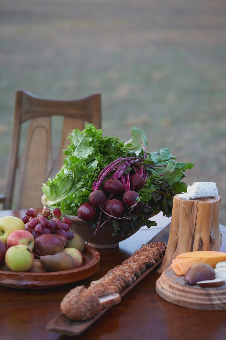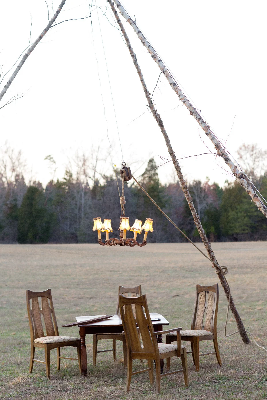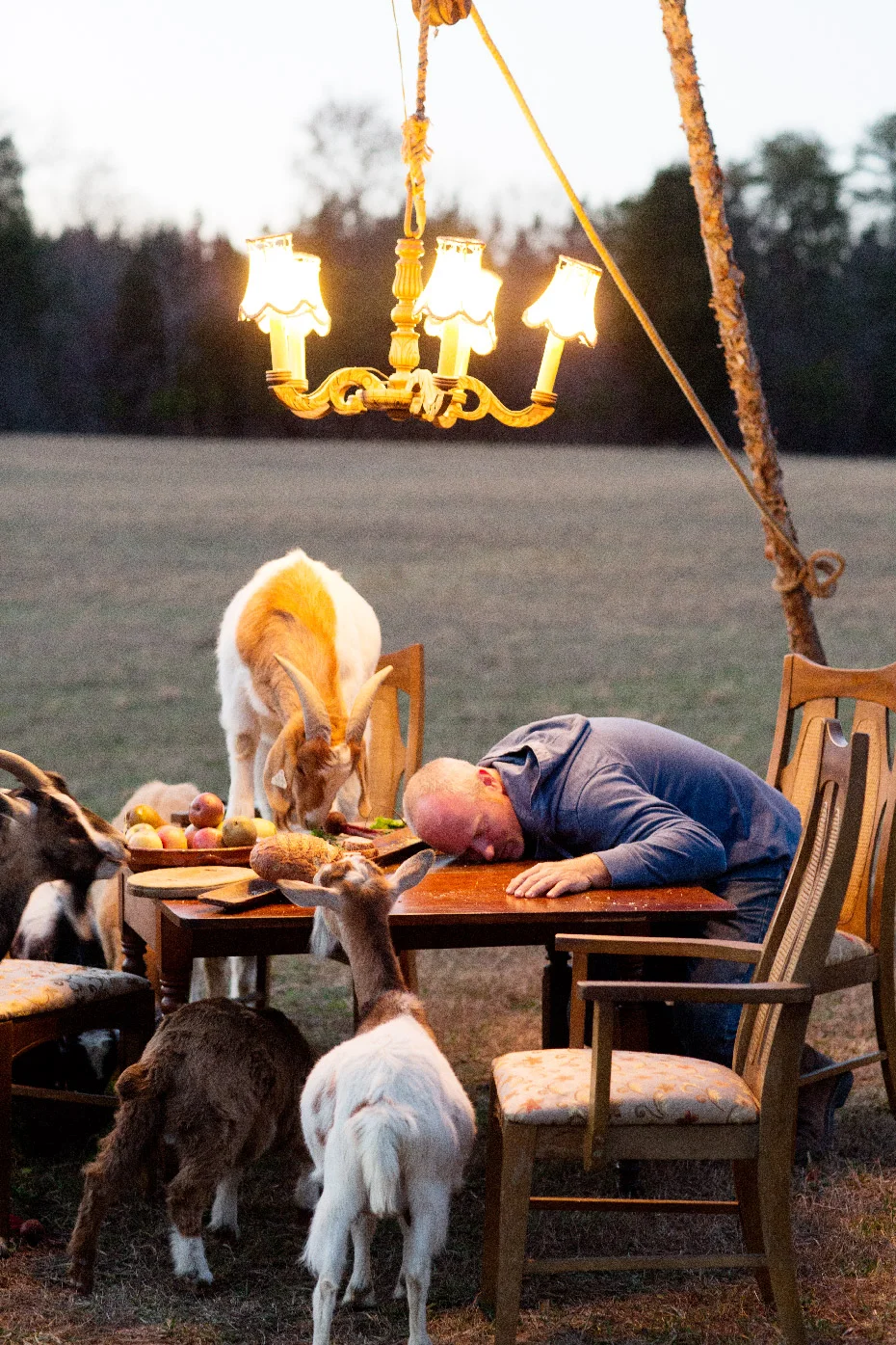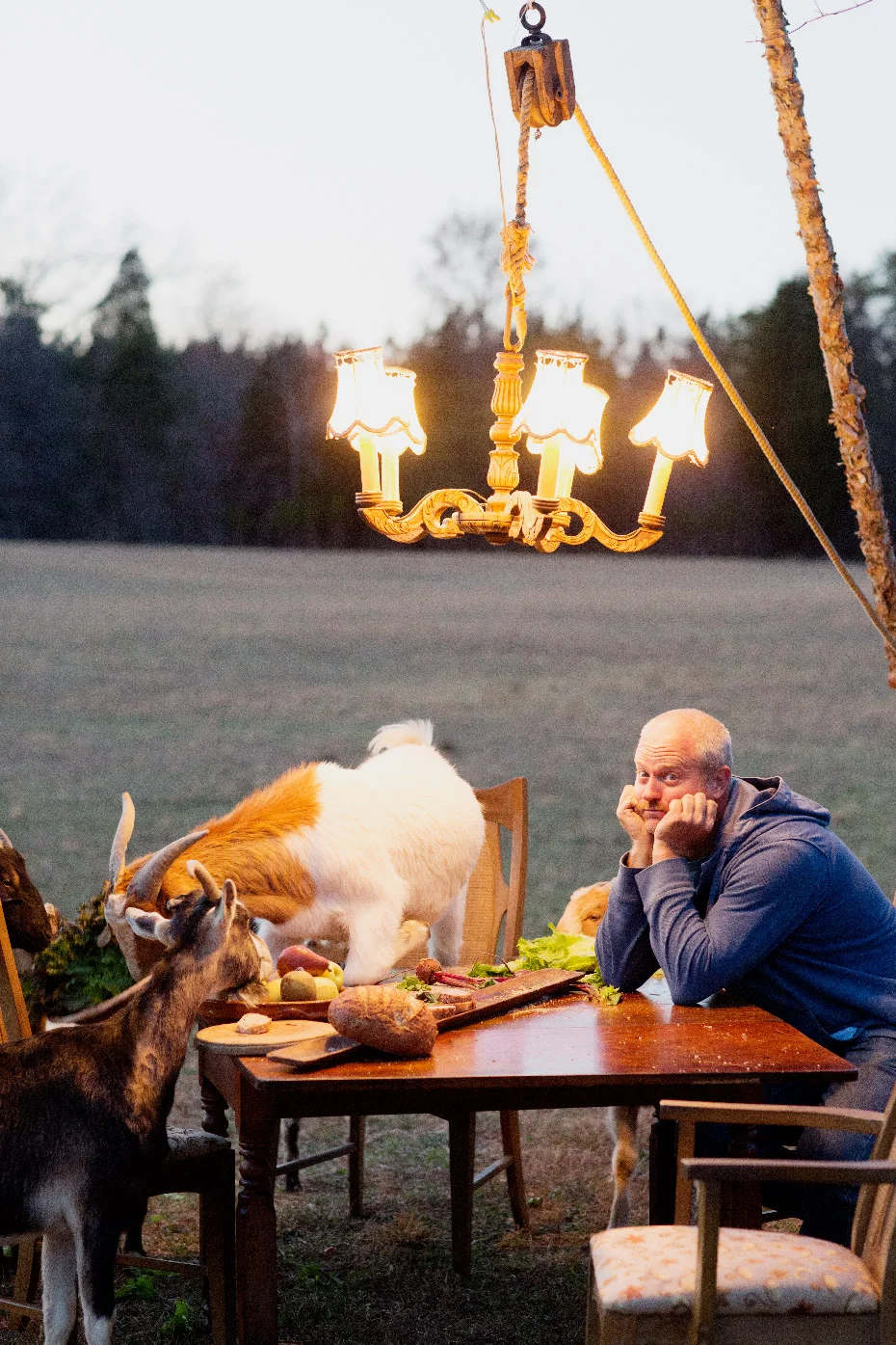 We had such a fun time shooting Part III of Fashionable Farmers. It was the last shot for the day and it was worth the wait for sure. Matt, our stylist put up a tripod to hang a chandelier and laid out a delicious spread on the table and then it was go time. It was pretty funny to try to ignore the goats jumping up on the table and basically devouring the food,.