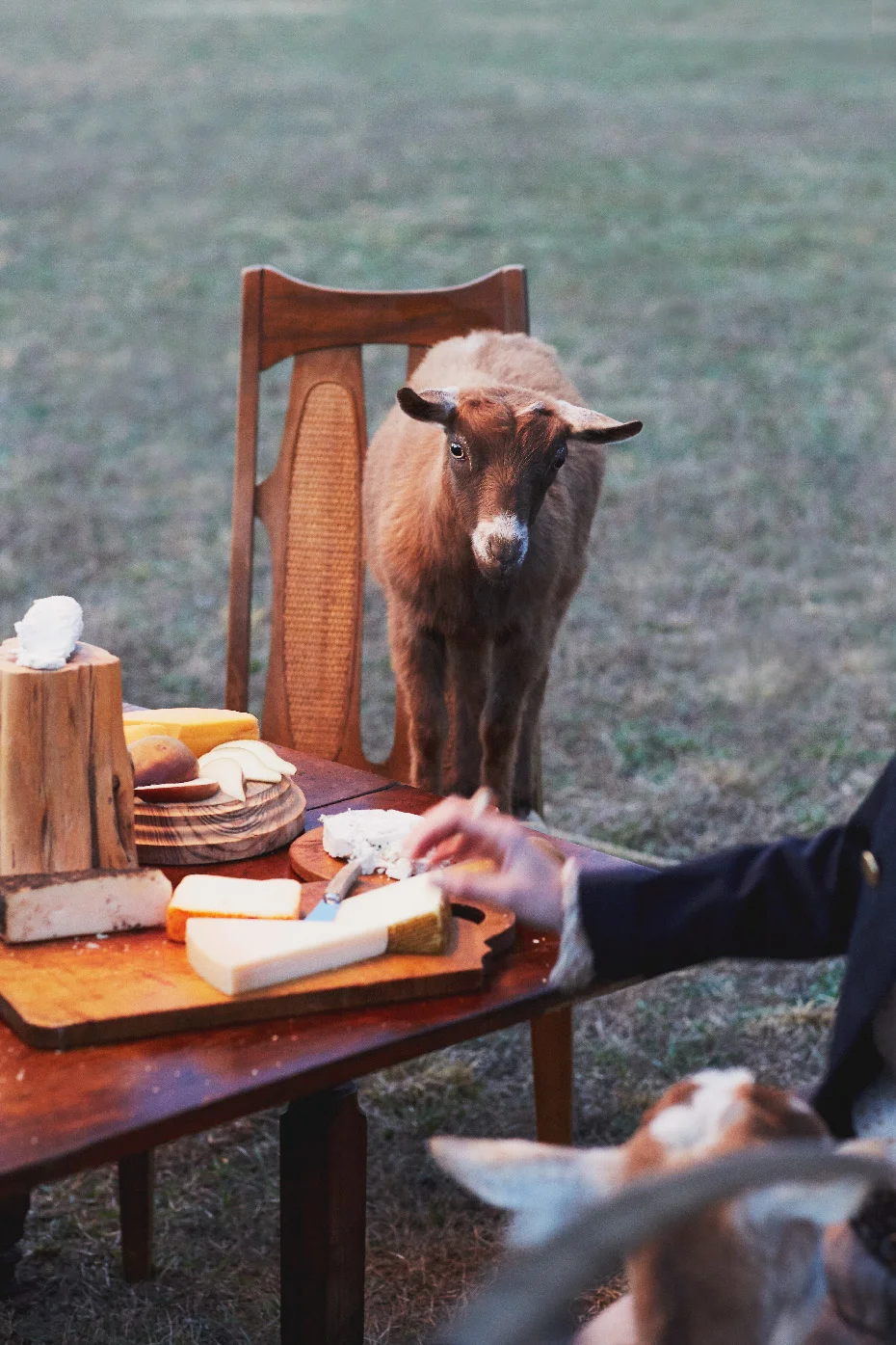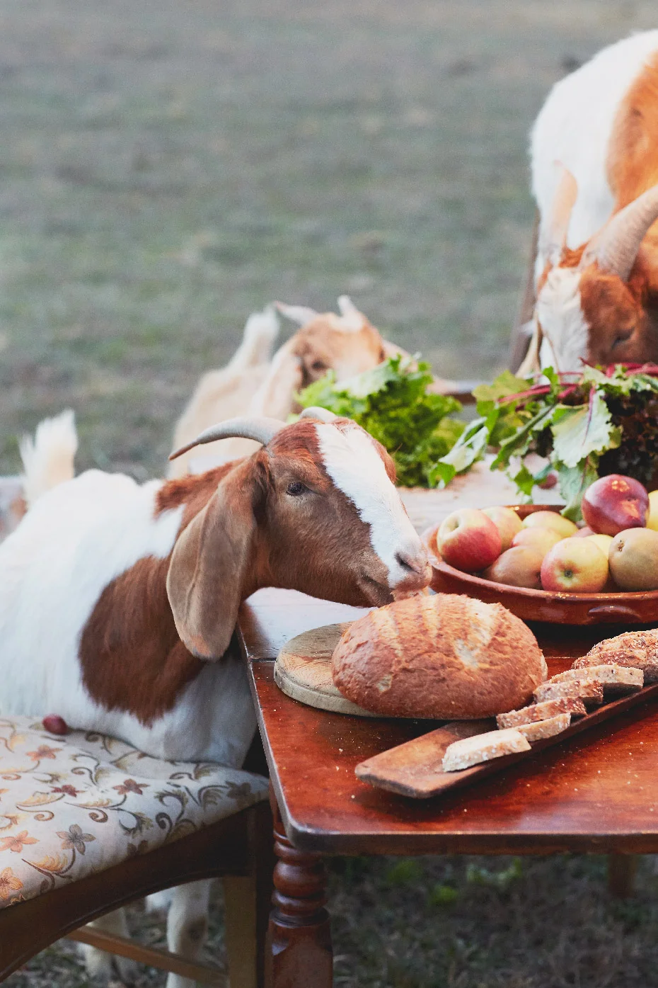 I have always had this silly fantasy of letting my vizsla Simon Henry loose in a fancy restaurant just to see what would happen. I guess the next best thing is letting a herd of goats partake of a feast in a field with beautiful people.